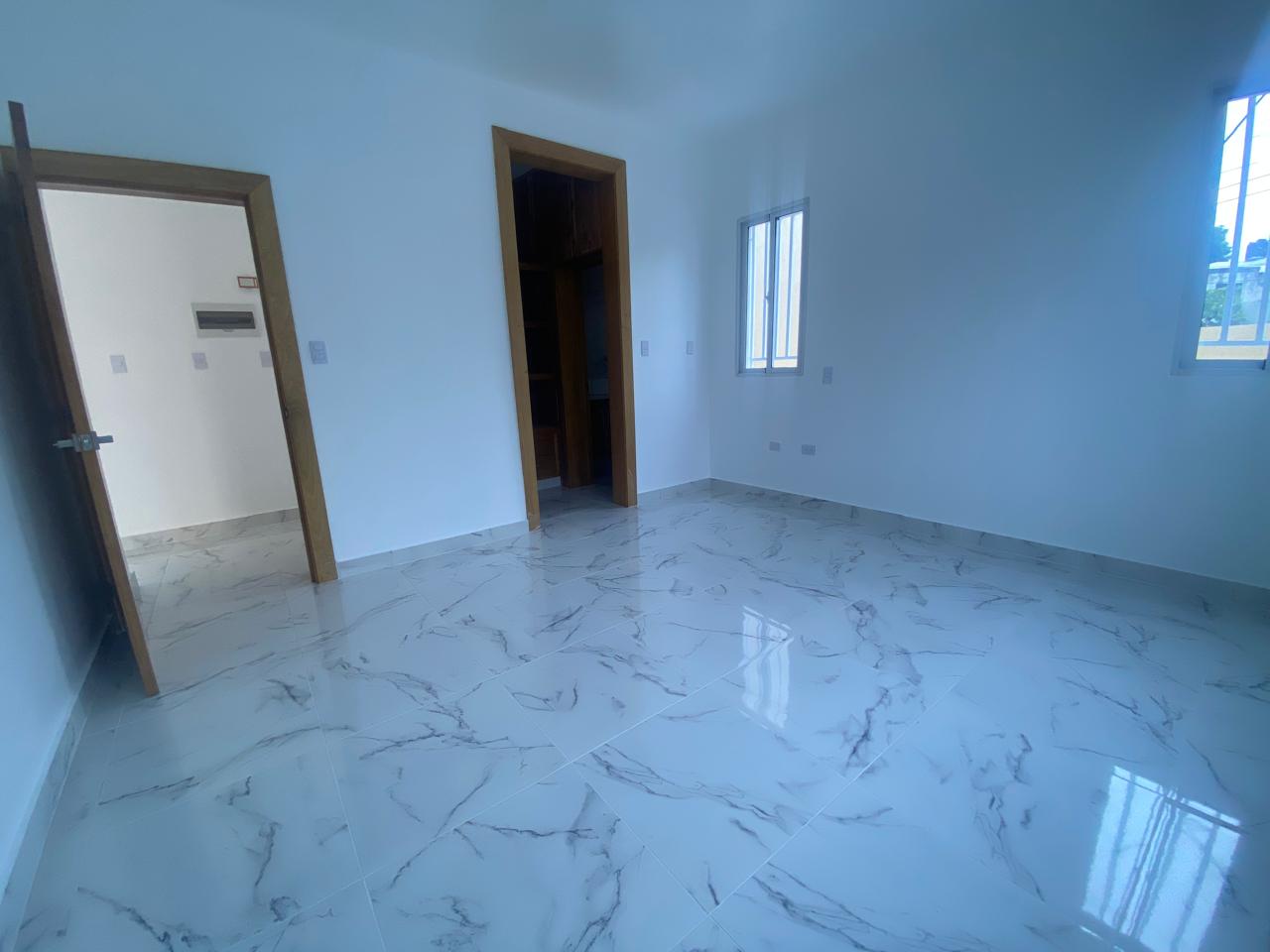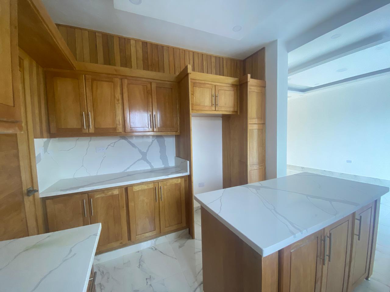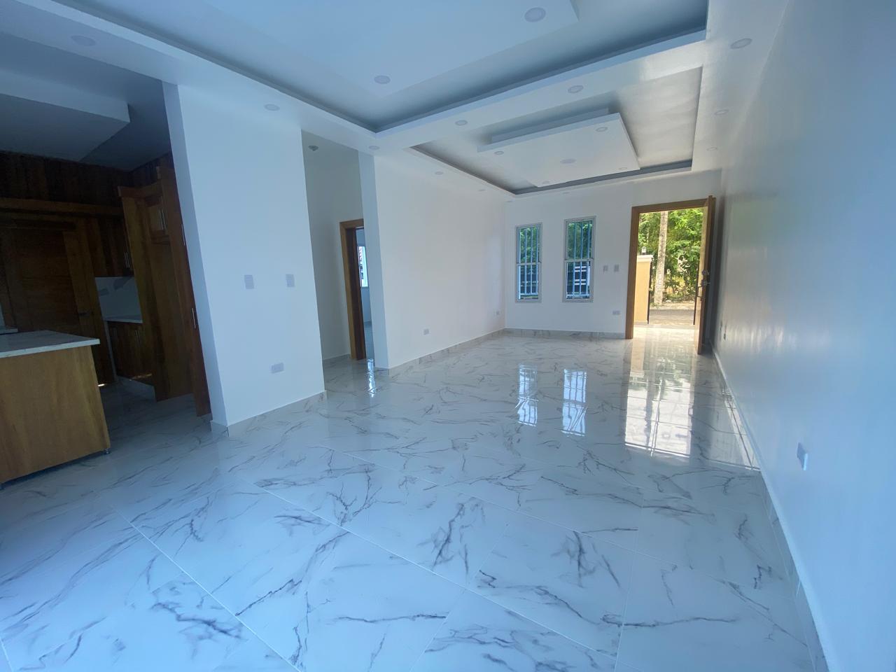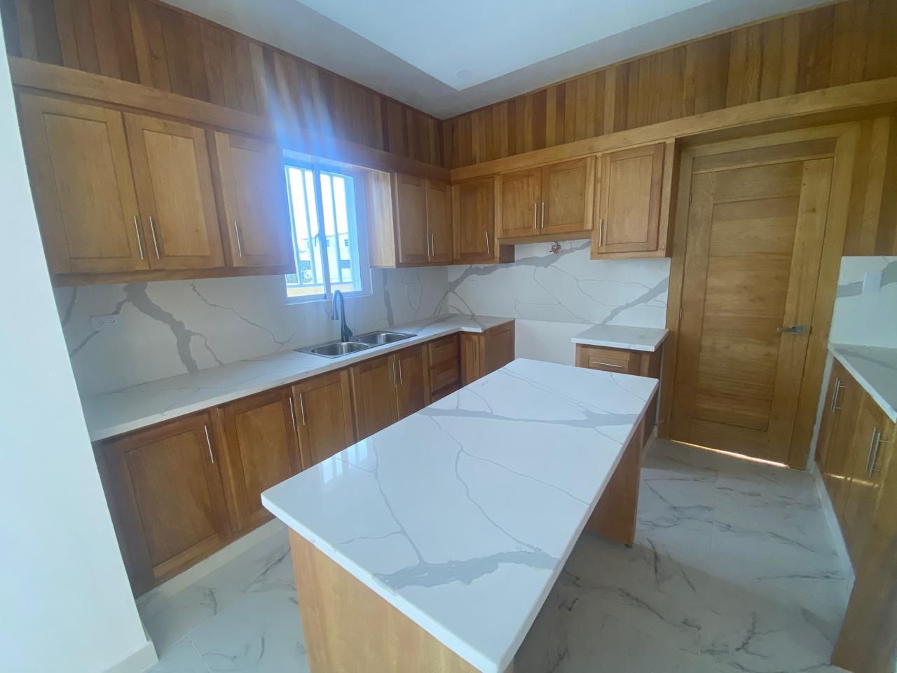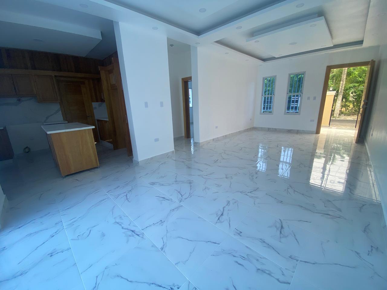 La propiedad cuenta con tres habitaciones, incluyendo una habitación principal amplia con vestidor y baño privado, dos habitaciones secundarias con clósets grandes y un baño común con ducha. La sala y el comedor se integran en un espacio luminoso que conecta con una cocina moderna equipada con tope de granito, gabinetes y puertas en roble importado, reflejando un alto estándar de construcción.