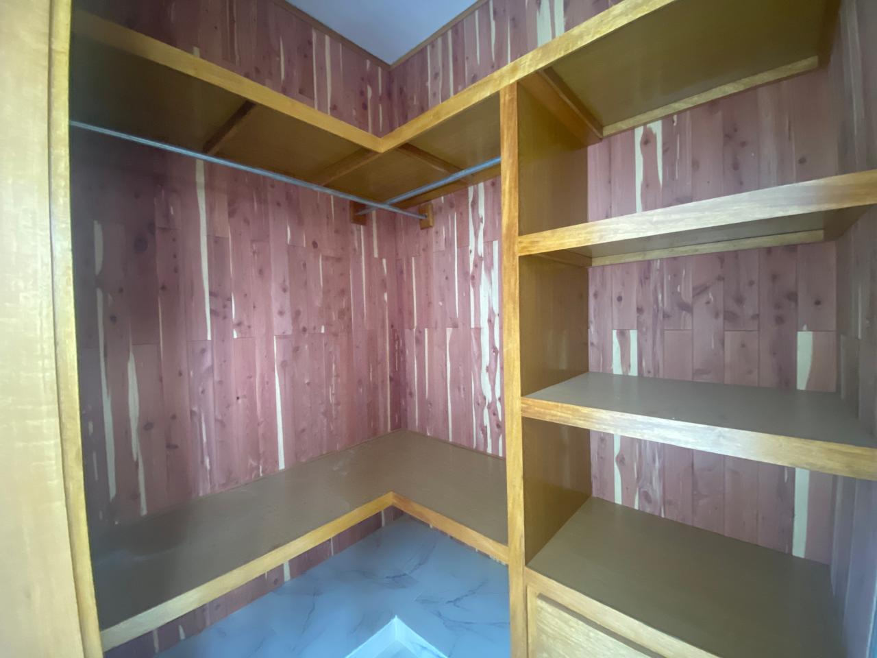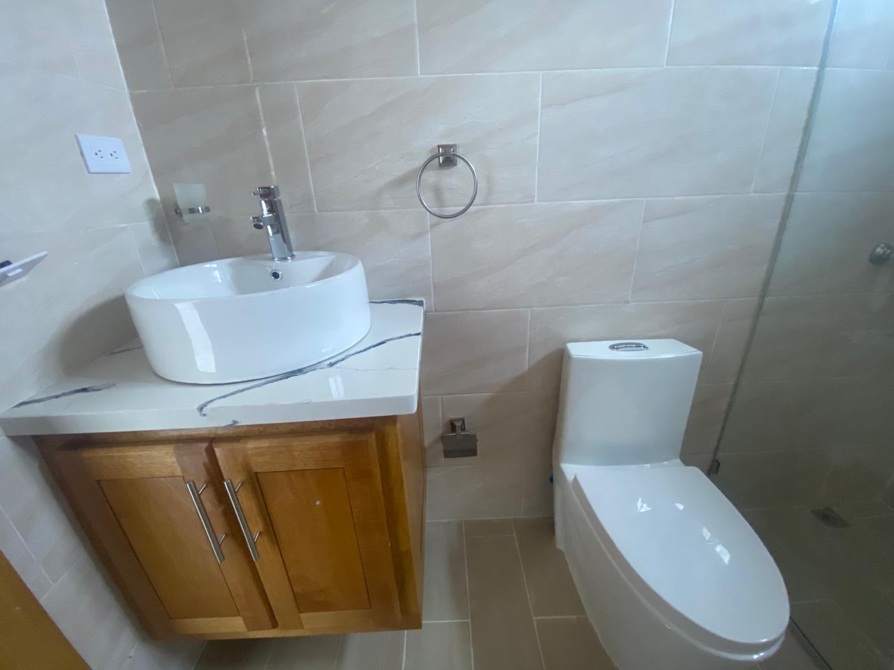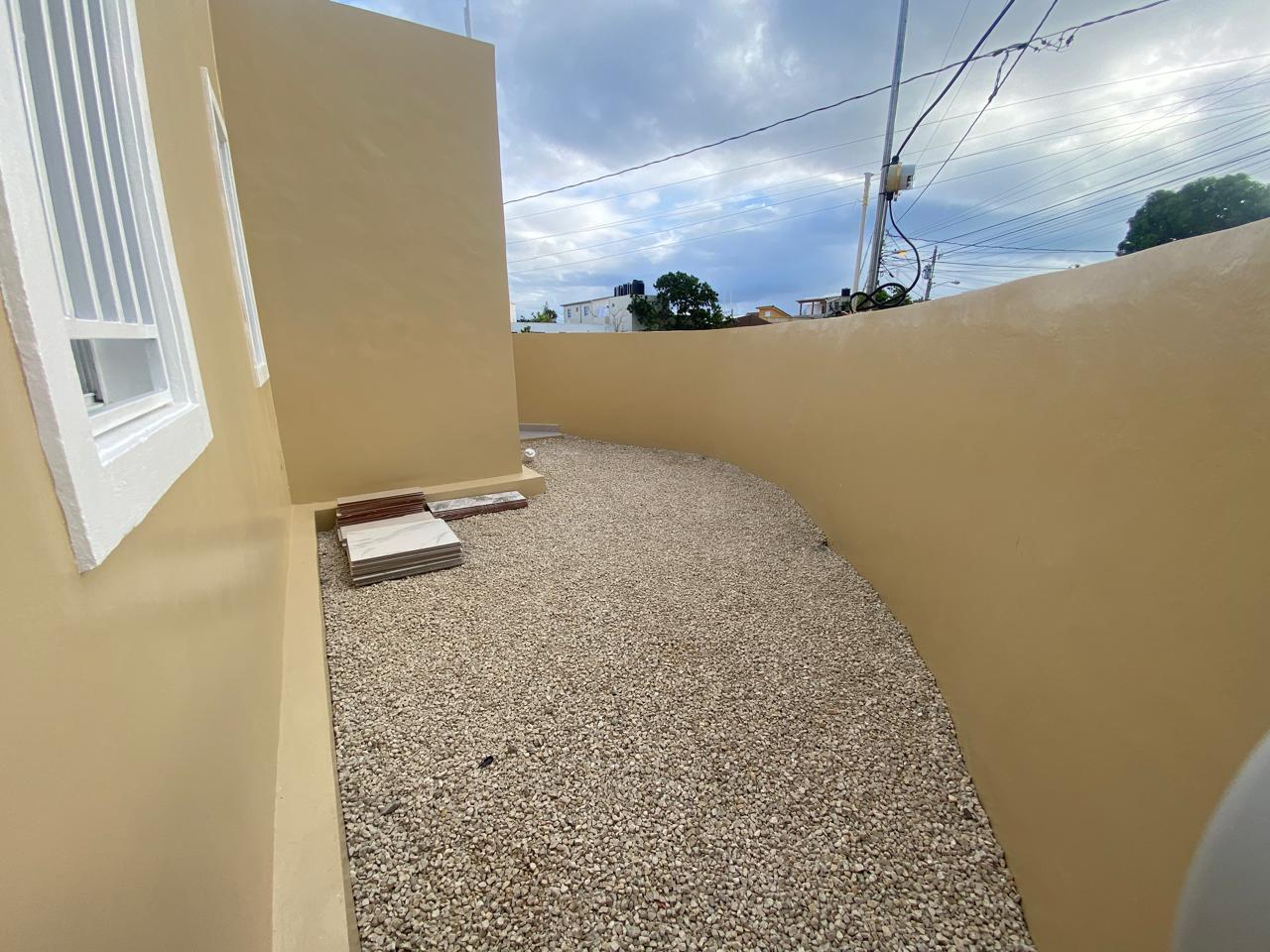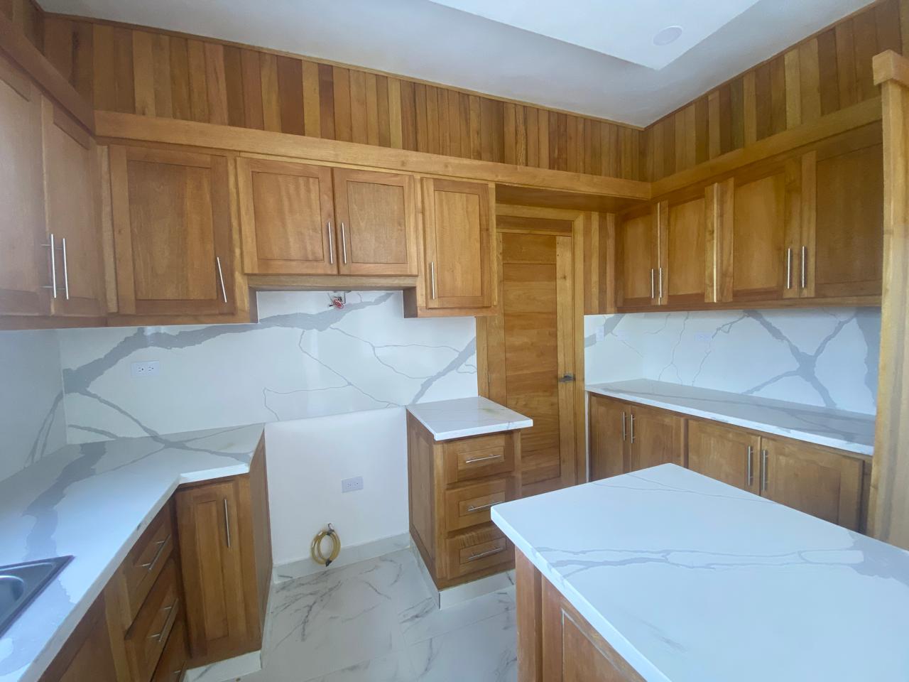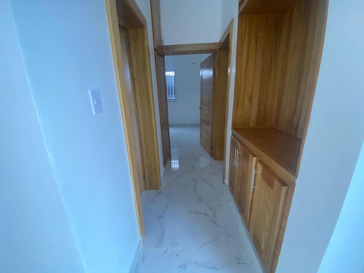 La propiedad cuenta con tres habitaciones, incluyendo una habitación principal amplia con vestidor y baño privado, dos habitaciones secundarias con clósets grandes y un baño común con ducha. La sala y el comedor se integran en un espacio luminoso que conecta con una cocina moderna equipada con tope de granito, gabinetes y puertas en roble importado, reflejando un alto estándar de construcción.