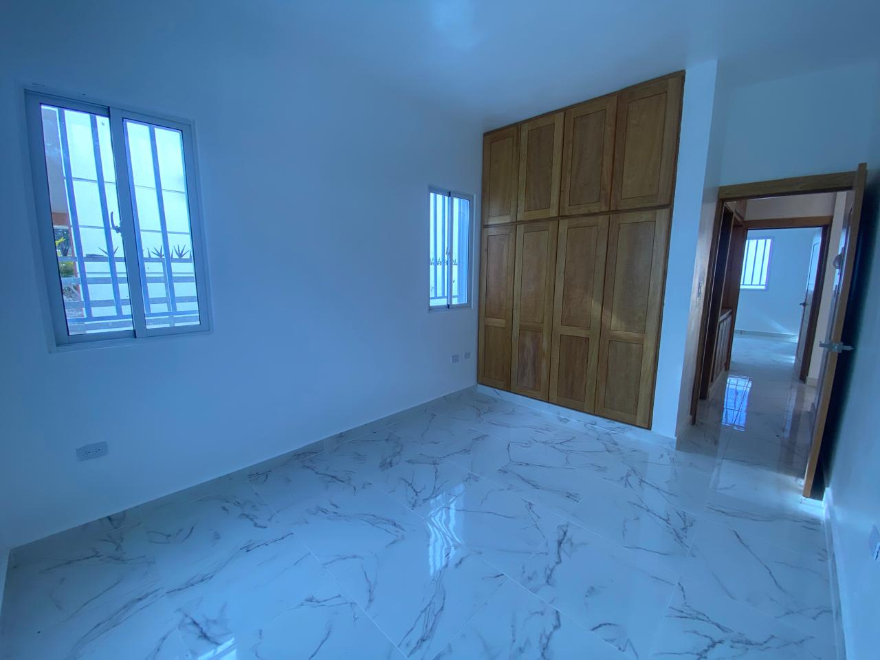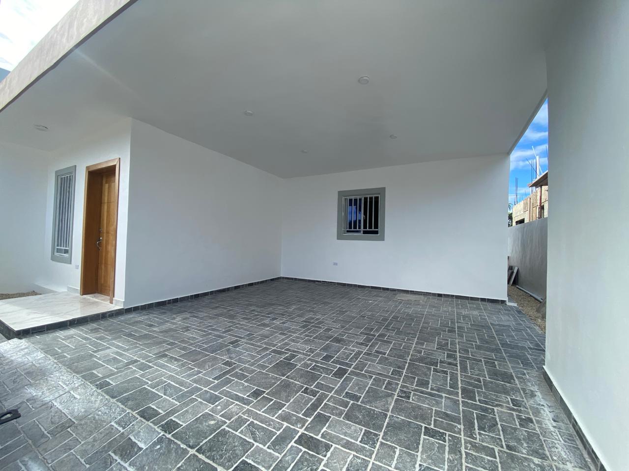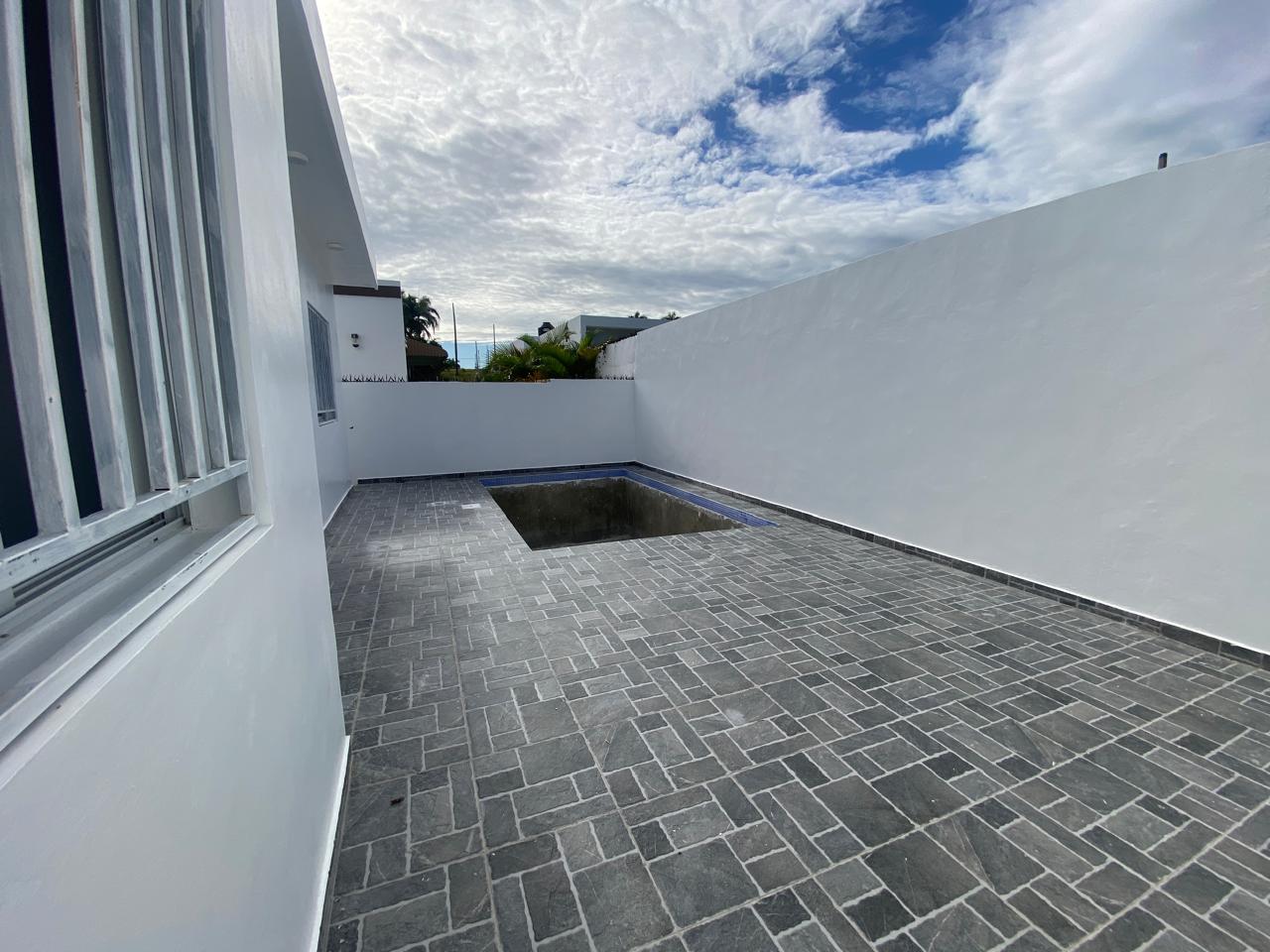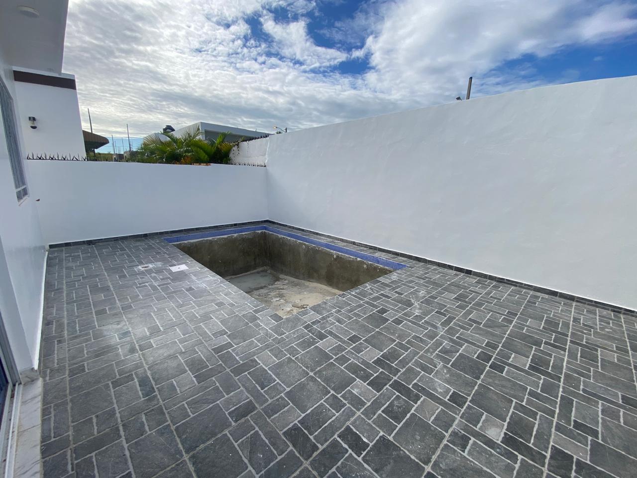 La propiedad cuenta con tres habitaciones, dos baños, sala, comedor, cocina con tope de granito, pisos en porcelanato español, galería y marquesina para dos vehículos. La habitación principal incluye su propio baño, y además posee un baño común para las demás habitaciones. Esta casa en venta en Puerto Plata también ofrece piscina privada, cisterna, área de lavado, calentador, ventanas en cristal y aluminio P65, gabinetes, puertas y detalles en roble importado, así como pre-instalación para cámaras de seguridad.
